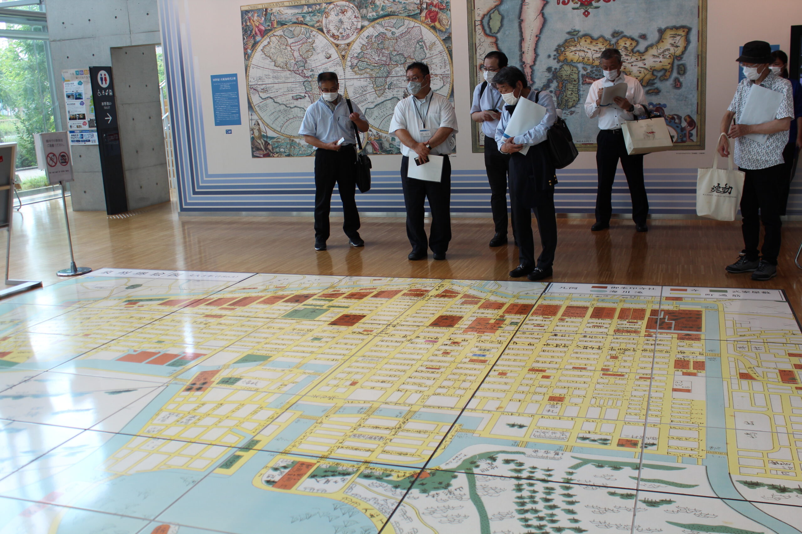 【千利休茶の湯館】 1522(大永2)年、和泉国・堺の豪商「ととや」に生まれた「千利休」は、その生涯の前半を堺で過ごしました。その利休と堺のかかわりを読み解き、利休や堺のまちと天下人とのつながりや、利休によって革新・大成された茶の湯(わび茶)が分かりやすく紹介されています。利休と茶の湯の歴史文化・平等思想を実感することができます。また画面を触るとさまざまな解説が浮かび上がり、行列の中には、南蛮人に扮する堺商人も見受けられ、堺の人たちと世界の深い交流が感じられます。「茶室(床部分)の想定」のコーナーでは、堺今市町にあった利休屋敷の武野紹鷗(堺の豪商で、利休の茶道の師の一人と言われている)に倣(なら)った茶室の床と、最晩年を過ごした京聚楽屋敷の茶室の床を想定した比較展示や紹鷗や利休の茶の湯と、その時代に関連した資料が展示されています。VR体験による「タイムトリップ堺」のコーナーでは、2021(令和3)年4月7日からVRスペースが新設され、環濠都市として栄えた堺のまちを体感できます。